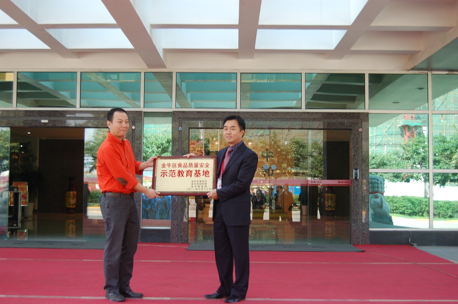 9月29日上午,金牛区食品质量安全示范教育基地授牌仪式在我司总部行政楼前举行。区食安办主任、食药局副局长王磊一行领导莅临我司出席授牌仪式,尊龙网站首页食品董事长吕金刚率公司员工参加授牌仪式。
